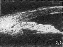 8 多种机制共存型 (瞳孔阻滞 %26#02; 周边虹膜肥厚) 闭青, 术后周边虹膜变平坦, 但仍见肥厚虹膜向房角处堆积, 房角仍狭窄关闭