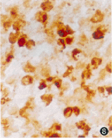 2.角膜溶解穿孔期:(1)角膜:淋巴细胞显著增多,在角膜缘及角膜周边部数量约为烧伤初期的10倍,在角膜溃疡及溶解区,亦可见少至中等量的淋巴细胞,其中以CD+ 3最多,其次为CD+ 4和CD+ 8淋巴细胞;角膜缘可见大量的巨噬细胞和树突状细胞,密集成堆,难以准确计数,用调焦的方法发现这些细胞分布于角膜各层,由角膜缘向角膜中央逐渐减少(图4);在角膜溶解穿孔附近及角膜缘,可见多量MHC-Ⅱ类抗原阳性细胞,其形态由烧伤初期的圆形变为多形性(图5)。(2)虹膜:可见大量的CD+ 3、CD+ 4及CD+ 8淋巴细胞(图6),CD+ 4淋巴细胞明显多于CD+ 8;巨噬细胞和树突状细胞在虹膜根部较多,树突状细胞的突起长而粗大且增多(图7);MHC-Ⅱ类抗原阳性细胞除数量显著增多外,形态也呈多样性,大小不一(图8)。