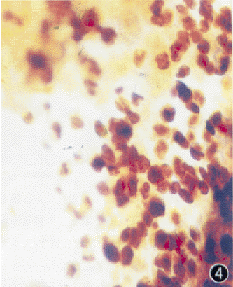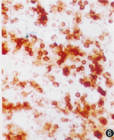 1. 烧伤早期:(1)角膜:角膜缘的淋巴细胞较正常眼增多,以CD+ 3淋巴细胞为主(图3),可见少量的巨噬细胞及树突状细胞,后者染色较淡;MHC-Ⅱ类抗原阳性细胞增多,仍以圆形为主。在角膜中央未见上述细胞。(2)虹膜:淋巴细胞、MHC-Ⅱ类抗原阳性细胞较正常眼明显增多,淋巴细胞仍以CD+ 3为主,CD+ 4、CD+ 8淋巴细胞较少;巨噬细胞与树突状细胞染色加深,数量稍有增加,巨噬细胞以中等大小的圆形细胞为主。