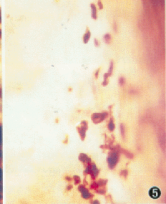 在临床上,眼部组织碱烧伤后的改变是个长期过程,除了角膜反复糜烂溃疡外,眼内葡萄膜炎亦久治不愈。在本研究中我们观察到,在角膜溃疡修复、大量新生血管生长的病变稳定阶段,虹膜平片上依然可见多量的各种阳性细胞,尤其是T淋巴细胞和MHC-Ⅱ类抗原阳性细胞。在另一组研究资料中,我们观察了视网膜和脉络膜组织平片,发现了类似改变。这提示眼组织碱烧伤后的慢性炎症亦与免疫反应有关,其造成的损伤进一步加重了碱烧伤后眼组织的病变,重者可致眼球萎缩。当然,碱烧伤后眼部的病理改变是一个复杂过程,有多方面的机制参与,免疫反应只是其中的一个重要环节,它与其它因素之间的关系(如胶原酶、氧自由基等)尚待深入研究。