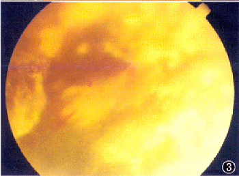 例3 男,14岁,因发现右眼视力下降30余天,于1997年12月1日收入我院。患儿于1997年10月28日右眼被足球击撞,发现眼前黑影,视力下降,在当地医院诊断为Coats病。转入本院时眼部检查:右眼视力眼前30 cm手动,光定位准确;左眼1.0。右眼眼压14.5 mm Hg, 左眼17.3 mm Hg。右眼角膜后有结晶样沉着物,房水混浊,玻璃体黄白色混浊,可见较多灰白色颗粒结晶,全视网膜呈青灰色隆起,多处视网膜固定皱褶,以视乳头周围及鼻上方周边部为甚。未见视乳头 (图2),全视网膜可见大量黄白色渗出灶及出血点(图3),其间有结晶状物。眼底血管荧光造影显示:(1)右眼周边视网膜血管闭塞。(2)右眼周边视网膜微血管瘤,血管扩张,行径异常。(3)右眼视网膜新生血管形成。(4)右眼视网膜全脱离。左眼检查未见异常。入院诊断:Coats病(晚期),伴渗出性及牵引性视网膜脱离。手术方法除同例1、2外,对大量的视网膜下增殖条索,做视网膜周边部近360°切开,以笛形针及视网膜钩分别取出视网膜下渗出物和增殖膜,视网膜完全松解后,注入重水,展平视网膜,最后行硅油与重水交换,手术成功。取出的视网膜下组织病理检查:可见丰富的纤维及细长形、梭形细胞并伴纤维素样渗出,有成团的变性红细胞,散在的淋巴细胞及色素样上皮细胞。术后随访4个月,患者视力为0.1,视网膜保持平复,未见明显的并发症。