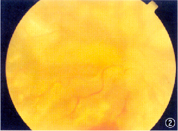 例1 男,18岁。因左眼视力下降5年,于1997年1月收住本院。眼部检查:右眼未见异常。左眼视力20 cm手动,角膜透明,房水清,晶状体透明,玻璃体混浊,视网膜全脱离,广泛视网膜前膜皱褶及增殖条索形成,以鼻上方为重,视网膜下可见大片黄白色渗出物,视网膜新生血管形成,眼底血管荧光造影显示:周边部视网膜血管明显扩张,新生血管形成,大量荧光素渗漏,其间有遮闭荧光现象。B超检查:玻璃体混浊伴视网膜脱离,未见占位性病变。入院诊断:Coats病伴牵引性视网膜脱离。采用巩膜冷凝、环扎、硅胶加压、巩膜外排液、玻璃体切除、视网膜前膜剥离、内排液及硅油眼内填充等治疗方法。同时,在颞侧周边部做90°视网膜切开,以清除视网膜下沉积的块状渗出物,尤其是黄斑区的渗出物应尽量清除干净。视网膜完全松解后,注入重水,展平视网膜。做眼内360°大范围的视网膜光凝,最后行硅油/重水交换,关闭巩膜穿刺口,缝合球结膜,手术成功。出院时视力提高至眼前30 cm指数,视网膜切开处粘合良好,视网膜平复,视网膜下渗出基本清除干净(图1)。术后1个月时,发现下方视网膜尤其鼻侧隆起,并有固定皱折形成,部分小血管呈白线状,局部视网膜缺血水肿,仅上方视网膜尚平复,视力仅为眼前20 cm指数。