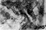 2.足突细胞周围胶原分布:在细胞足突与胶原接触区域可见大量抗Ⅰ和Ⅲ型胶原抗体的胶体金颗粒(图3),两者相比,Ⅰ型胶原的阳性标记较为显著。此外,在胞膜形成内褶的区域也可见丰富的胶体金颗粒(图4)。