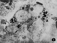 图1~3 带有色素颗粒的肾形足突细胞,可见一长足突(箭头示)和短足突(▲),P示色素颗粒,N示细胞核 ×9000