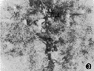 图3 示短足突末梢放大(L),周围有大量Ⅰ型胶体金颗粒 ×40000