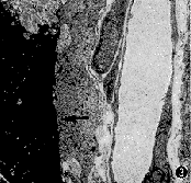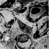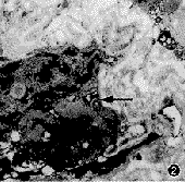 3.透射电镜观察:黄斑下NVM主要由新生毛细血管组成。管壁由血管内皮细胞和周细胞构成,管壁外可见不完整的类似基底膜的成分,管腔内除血浆成分外,偶见白细胞(图1)。在病理切片中可见尚未形成血管腔的内皮细胞和周细胞(图2)。此外,也偶见RPE细胞(图 3)。血管间质充满丝状的血浆沉积物(图4)。