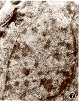 损伤后30天,G1组部分轴突呈空泡状变性,退变形似蜂窝状。髓鞘与轴突间形成空泡,髓鞘向轴突内突起,部分髓鞘板层结构不清。除见少突胶质细胞退变(细胞器不清楚,核异染色质集聚成块,常染色质区稀疏呈空泡化)外,尚见许多增生的少突胶质细胞(图7)。