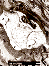 损伤后7天,G1组轴突变稀疏,呈空泡状或网状。轴突与髓鞘间有空泡形成,髓鞘有部分向内、向外突起,髓鞘板层分裂(图5)。G2组轴突未见明显异常,髓鞘有轻度板层分裂(图6)。