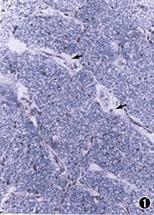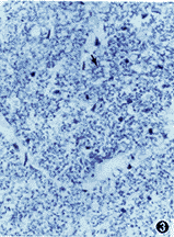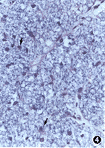 2.视神经少突胶质细胞:正常的视神经少突胶质细胞均匀分布于轴突周围。视神经间接损伤后14天时,有少突胶质细胞的增生,伤后30天时,少突胶质细胞增多达到较高水平(图4)。
