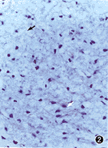 图4 损伤30天,少突胶质细胞增生达较高水平(黑箭头) Luxol坚固蓝-HE×400