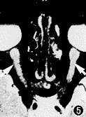 1.视神经炎的MRI改变∶(1)视神经炎症改变的异常信号,主要表现为T2WI呈高信号,采用脂肪和水抑制,术后信号更明显(图1,2)。(2)视神经鞘蛛网膜下腔改变,主要表现为脑脊液信号增宽或变窄。同时,MRI可显示病灶位置(视神经段)、大小(长度)、部位(全断面、中轴或周边)及视神经有无增粗或变细(图3~5)。