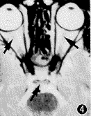 图4 示T2WI双眼球后段图像和视交叉高信号