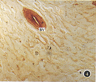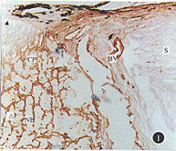 3.纤维连接蛋白(FN)的免疫过氧化酶阳性染色:在视乳头筛板无阳性着染,但在视乳头的血管呈阳性染色(图4)。