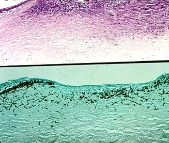 注释:组织切片显示溃疡形成,深层炎症反应。真菌染色显示菌丝深入基质层。