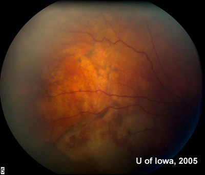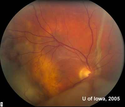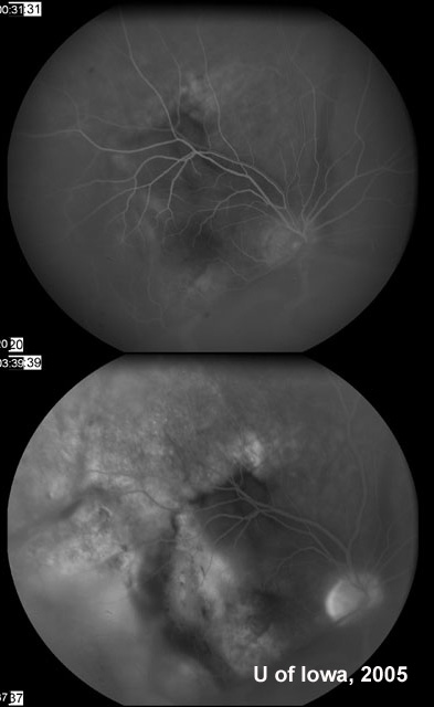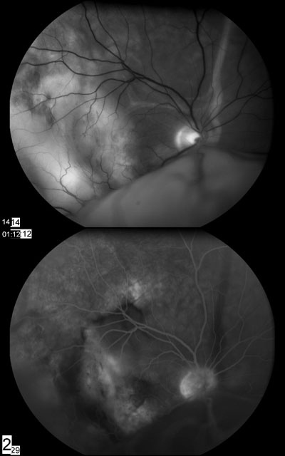 临床特征:61岁男性出现右眼疼痛及视力模糊,门诊就医。现病史:患者就医前6周开始注意到视力出现模糊,从那时起开始疼痛且持续加重,因此,患者就诊于当地的眼科医师。在当地,他的视力为20/80,医生注意到颞下脉络膜有侵润及渗出性视网膜脱离,进行了眼部声象图检查并观察到脉络膜轻微增厚。由于患者有肺癌病史,进行了转移检查(见下图)。在门诊部进行了头部及眼部的MRI,显示团块或感染阴性。实验室的检查也是阴性。随后,用光凝固法对脉络膜损害进行了检查。此后,视网膜下液大部分被吸收,视力又稳定下来。 但是,3-4周后,患者疼痛加重、出现恶心、视力又下降到20/80,遂返回在当地住院,进行症状控制并进一步检查。检查显示,注视远处时疼痛加剧,眼压正常,前段检查正常。眼球对触摸敏感。眼底检查发现又出现视网膜下液。重新进行了声象图检查,轻微的脉络膜增厚非常清晰,但是没有分离的团块。患者被诊断为后巩膜炎,用类固醇类、非甾体消炎药及镇痛药进行治疗。通过用药,患者疼痛和视网膜下液开始都有减少,但是在2个月内又复发。 患者开始使用氨甲喋呤,并去Iowa大学进行会诊。检查如下。病史• 心血管病史(心脏支架,1999及popliteal bypass, 2003)• 2003年肾囊肿囊肿切除术• 类型不确定的关节炎• 2003年因腺癌进行肺部肺叶切除术因切除,1个受累淋巴结,无转移灶也无复发家族/社会史• 家族有糖尿病,高血压,中风及心肌梗塞病史• 戒烟并很少饮酒用药情况:阿斯匹林,氯吡格雷,美托洛尔眼部检查• 最佳矫正视力为:右眼20/50-,左眼20/20+• 眼运动性:完整• 瞳孔:不均 右眼6 --> 4 mm,左眼4.5 --> 2.5 mm• 眼内压:右眼左眼分别为14及18mmHg• Hertel exophthalmometer:正常(右眼20mm,左眼20mm,基值102mm)• 前段:右眼睫状体部轻微潮红,但前段没有细胞和潮红。其他方面不明显。• 眼底检查:右眼出现大疱状、移动的、渗出性、下部视网膜分离,视网膜下无黑色素的脉络膜团块(见图2a及2b)玻璃体清楚。左眼眼底正常(见图1)