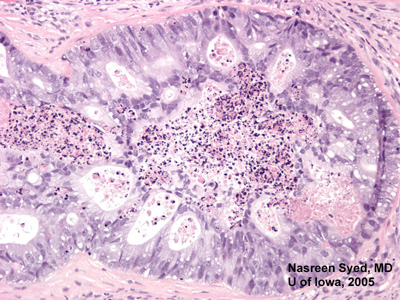 图6:百倍镜观腺瘤伴中心性坏死。肺部腺癌迁移。