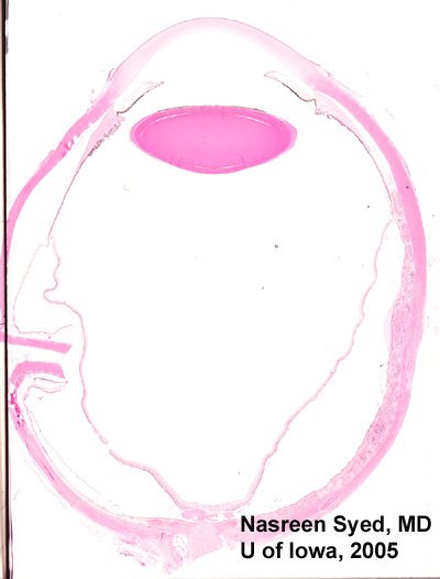 图4:低倍镜眼球观:眶后切面。注意显微照片右半部大范围的脉络膜增厚。