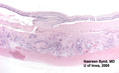 图5:注意脉络膜上的腺样瘤。也注意脉络膜和视网膜之间的大面积的纤维化。