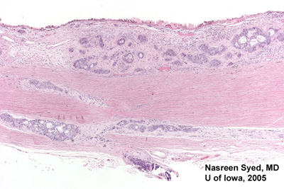 病程 右眼进行了超声检查。显示脉络膜厚度为3mm。该区域有中至高度发射反射及高度血管供应。没有累及Subtenon对侧或巩膜上层没有累及。 重新进行系统全身的检查。肝功及其他实验检查基本正常。PET扫描显示胸椎处损害,怀疑为恶性的。该病例会诊的肿瘤放疗学组推荐进行眼部的活检。 通过气液交换,眼内激光及视网膜造孔术进行了平坦部玻璃体切割术。进行了细针抽吸活组织检查,视网膜重新附着在团块上。但是细针抽吸活组织的组织学检查没有发现细胞物质。 至此,治疗要考虑的问题包括,团块未确定为阳性、患者眼部疼痛未间断,胸椎可能有恶性肿瘤。如果发现损害是恶性的,应该考虑剜除术,因为与姑息治疗相比,这更有助于确定治疗方案。此外,眼睛的组织检查也有助于诊断治疗胸椎的损害。 为了控制症状并进行诊断,决定进行剜除。 病理学 • 视网膜:透视无缺损 • 腺组织有坏死 • 涡(状)静脉及睫状神经有侵入 • 细胞角蛋白AE1/AE3,CK7细胞角蛋白,甲状腺转录蛋白(TTF-1)阳性(见图4-8及如下讨论)