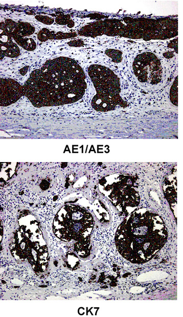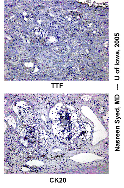 图8:抗细胞角蛋白抗体的免疫组化染色(AE1/AE3, CK7, CK20)。只有CK20是阴性的,如预料中(在一些胃癌和肾癌中标记是阳性的)。CK7为阳性的且为肺癌及乳腺癌的一个标志。AE1/AE3是阳性的。这是上皮性肿瘤的一个标志。TTF-1染色是阳性的,与甲状腺转录蛋白相对应。在一些肺部和甲状腺瘤的染色正如预料中的是阳性的。