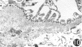 对照组:大鼠RBM和GBM的外疏松层可见排列较规则的多聚亚胺染色颗粒大小较一致,多聚亚胺染色颗粒代表负电荷位点存在的区域,负电荷位点主要由硫酸类肝素多糖蛋白构成(图9,10)。与RBM相比,GBM上的多聚亚胺染色颗粒数量多、分布密度大。