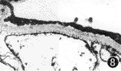 实验组:大鼠随病程的发展至6个月时,无论是RBM还是GBM,其外疏松层的多聚亚胺染色颗粒数量均明显减少,即颗粒的间距显著加大,并可见颗粒丢失现象(图7,8)。实验组与对照组比较,差异有显著性(P<0.01)(表3)。