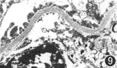 图7 链脲佐菌素注射后6个月RBM,示RBM负电荷位点减少 ×25000图8 链脲佐菌素注射后6个月GBM,示GBM负电荷位点减少 ×20000