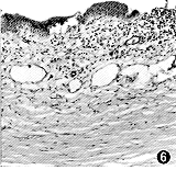 15%内毒素组:角膜基质内可见许多新生血管自角巩缘伸至内毒素植入物附近,新生血管管径粗细不等,微袋周围可见大量的炎性细胞浸润(图6~8)。
