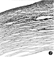 图7 CDI治疗Ⅰ组第12天,角膜组织中有炎性细胞浸润,无明显新生血管增生 HE×115 |