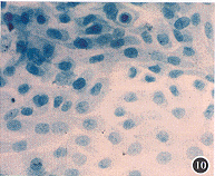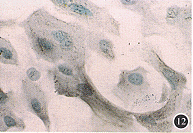 4.角质蛋白K3表达:在正常兔角膜组织切片的免疫组化染色中,角膜缘基底层细胞角质蛋白K3不表达,表现为细胞染色呈绿色,而表浅细胞则为阳性呈棕黑色,并且越向角膜中央上皮细胞层角质蛋白K3表达越多,在中央上皮基底细胞也可见角质蛋白K3表达(图6~9)。盖玻片上生长的角膜缘上皮细胞在原代培养基本不表达角质蛋白K3(图10),在传2代细胞时大部分表达角质蛋白K3呈棕黑色(图11,12)。而角膜中央上皮细胞在早期即表达K3。
