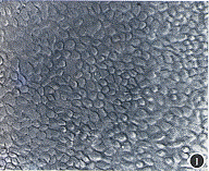 1.细胞培养:组织块接种后细胞很快呈膜状扩展生长,约10天达生长饱和,细胞大小一致,呈多角形,角膜缘和角膜中央上皮细胞的形态相同,仅后者细胞略大(图1,2)。不同的是角膜中央上皮细胞在传第1代后细胞基本停止生长,细胞从多角形变为长梭形,不能形成细胞单层(图3);而角膜缘上皮细胞能够保持增殖至第3~5代后才逐渐丧失上皮细胞形态,生长停止(图4)。