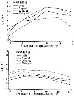 在EGF的作用下,角膜缘干细胞的增殖能力提高超过角膜中央上皮细胞,尤其是在质量浓度为5~20 ng/ml时作用明显,而在质量浓度为100 ng/ml时作用则相对下降,说明该EGF在体外对角膜上皮细胞的促增殖作用有量效关系[8]。
