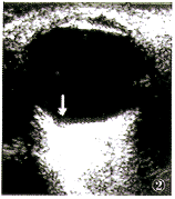 图1 黄斑缺损患眼彩色眼底像。黄斑部圆形缺损区内及边缘有色素堆积,脉络膜毛细血管层缺失,可透见少数纡曲的脉络膜大血管,缺损区表面视网膜血管行径正常,无间断 图2 图1患眼B型超声图像。黄斑缺损区凹陷,巩膜向后膨出(箭)