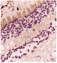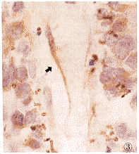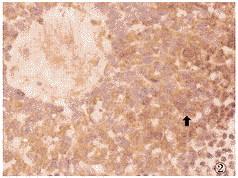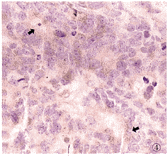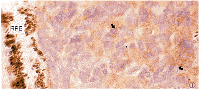 Fig.1 VEGF immunohistochemical reaction of RB tissue(non-differentiated)、VEGF positive expressed,cytoplasm of RB cells showed positive reaction(arrow) LSAB method ×1000 Fig.2 VEGF immunohistochemical reaction in paeudorosete VEGF potitive expressed cells located at outer part of paudorosette(arrow) LSAB method ×250 Fig.3 VEGF immunohistochemical reaction in vascular endothelial cells of RB tessiue.Cytoplasm of vascular endothelial cells in RB showed VEGF positive reaction(arrow) LSAB method ×1000 Fig.4 VEGF immunohistochemical recction in normal retina.Rods and cones of normal retina.showed positive VEGF reaction(arrow) LSAB method ×200 Fig.5 VEGF immunohistochemical reaction in differentiated RB tissue.Cytoplasm of differentiated RB cells showed weak positive VEGF expression(arrow) LSAB method ×250