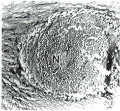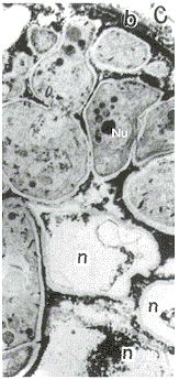 图6 电镜证实菌丝隔、核(Nu)、部分细胞器和坏死的菌丝(n),b示玻璃膜,C示脉络膜 醋酸铀,枸橼酸铅 ×1 000