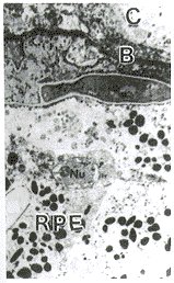 Fig.6 EM revealed fungal septa,nucleus,a part of organelle and necrotic hyphae.b:bruch′s membrane,C:choroid uranium,lead ×1 000 |