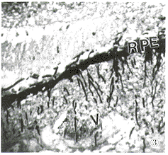 图1 在视网膜坏死区(N)和周围组织内有大量菌丝存在 PAS ×40 图2 菌丝阻塞视网膜血管,存在于视网膜和玻璃体内,视网膜严重受损 六胺银 ×40 图3 菌丝栓塞脉络膜血管(V),分布于脉络膜内,破坏脉络膜,部分菌丝穿过色素上皮(RPE)到达视网膜内 六胺银 ×40 图4 视网膜内毛菌丝粗大,呈钝角分支,视网膜受破坏 PAS ×40