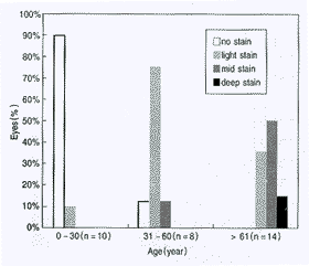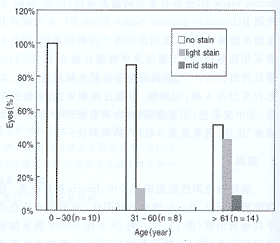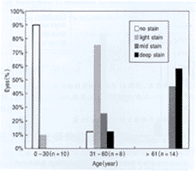 显示染色程度随年龄而增强,条形图代表各种染色程度在不同年龄组中所占的百分比(n=眼数)