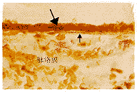 Fig.2 Photomicrograph of the macular region of section from a28-year-old donor.Light staining of Bruchs membrane (small arrow)in a thin line pattern and RPE cells(large arrow)is demonstrated.Cryosections stained with oil red O and counter stained with Mayers haematoxylin ×400