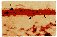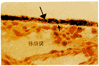 Fig.3 Photomicrograph of the macular region of section from a72-year-old donor.Deep staining of Bruchs membrane(small arrow)in a broad line pattern and RPE cells(large arrow)is demonstrated.The choroid intercapillary pillar(middle arrow)is also stained.Cryosections stained with oil red O and counter stained with Mayers haematoxylin ×400