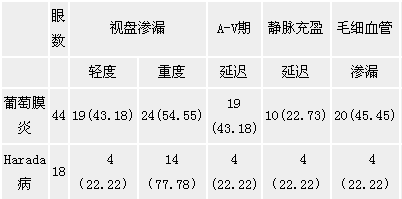 由于荧光素钠很大部分被视网膜色素上皮和脉络膜的色素及炎性渗出所吸收,影响了脉络膜背景荧光的观察,但可观察到视网膜组织改变的特征。葡萄膜炎患者出现的视盘强荧光甚至边界模糊为视盘炎症的表现。视网膜静脉充盈延迟,比正常平均晚2秒,毛细血管的扩张、血管壁着染或毛刷状渗漏与有关文献报道一致[5],表明炎症损害了内层血视网膜屏障的功能,引起血液循环受阻。FFA显现的视网膜后极或周边部早期多发性点状荧光素渗漏逐渐增强,晚期融合成片状或多湖状强荧光区,表明炎症导致外层血视网膜屏障功能受损。黄斑区渗漏使黄斑区细胞外液积存在外丛状层Henle纤维间,形成特有的花瓣状荧光素积存即黄斑囊样水肿。Harada病的视网膜色素上皮病变重于葡萄膜炎,葡萄膜炎的色素上皮渗漏为点状或斑驳状,Harada病为多湖状和大泡状渗漏且伴有神经上皮脱离。然而,葡萄膜炎的血管异常重于Harada病。黄斑的渗漏与炎症的严重程度相关,轻者点状渗漏,重者呈花瓣状和轮辐状渗漏。