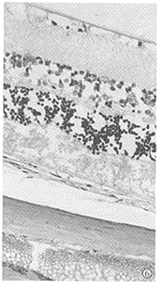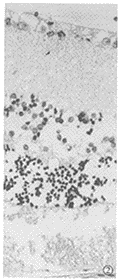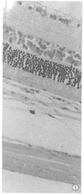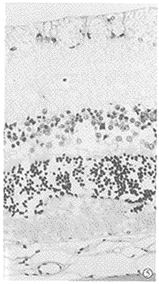 图2 对照组:治疗20d视神经纤维层、内网层及视杆锥层明显疏松、水肿、结构紊乱,内、外核层细胞间明显水肿、疏松,细胞排列明显紊乱,视网膜明显水肿增厚 HE×200
