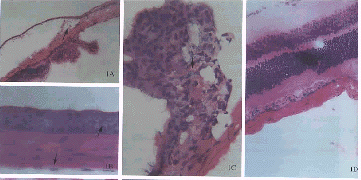 用药后2h,1,2天、1,2,4周分别摘取上述5组小鼠眼球,立即冰冻切片,固定,PBS冲洗,β-gal染色,PBS冲洗,HE染色,甘油或中性树胶封片。显微镜下观察并照相。