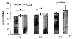 RCT为同步记录的P-VEP P100潜伏期减去P-ERG b波潜伏期,表示刺激信息由视网膜传递至视皮层所需的时间延搁。与正常对照组比较,屈光参差性弱视儿童的弱视眼RCT在46.6′和20.7′刺激下明显延长,90′刺激无延长;非弱视眼RCT在三种空间频率均无明显延长。