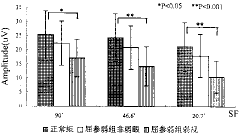 将屈光参差性弱视儿童弱视眼与非弱视眼b波潜伏期差值与正常对照组比较,除90′其差值较正常对照组小之外(P<0.05),其他均无明显差异(P>0.05),在三种空间频率b波振幅差值与正常对照组比较均无明显差异(P>0.05)。见表3。