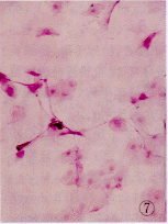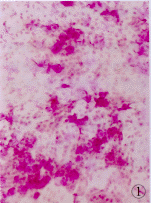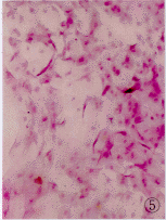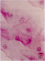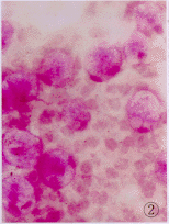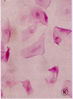3级:结膜上皮细胞胞浆内出现颗粒状物,核固缩崩解,上皮细胞胞浆成粉红色,N/C为1∶6~1∶8,出现不同程度的角化,杯状细胞完全丧失,视野下不见杯状细胞。见图6~8所示。