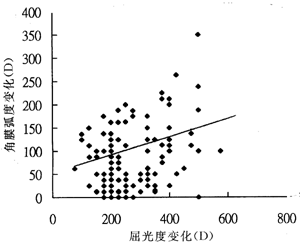 2.2 角膜曲率:治疗后,角膜曲率皆有变平现象,图2说明角膜曲率变平的幅度及近视屈光度下降幅度的关系,虽然误差较大,但仍然可看出两者之间有一定的关系。
