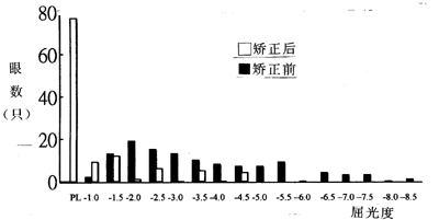 2.1 屈光度:所有接受近视矫正者,经过治疗后屈光度均有明显下降而且全部有效,从矫正前屈光范围-0.75D至-8.25D下降至-4.50D以下,从(图1)可看出很多患者视力已恢复正常,屈光度最多降低近视-5.75D,散光-2.25D。