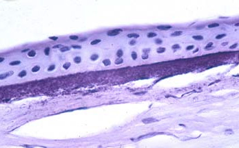 前弹力层钙质沉积(嗜碱染色),其下瘢痕组织形成