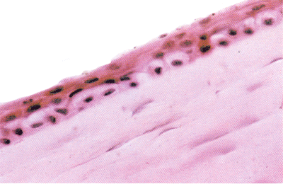 此例为植人性虹膜囊肿继发青光眼。角膜水肿,上皮变薄,仅有2~3层。基底细胞呈水泡状。板层水肿变厚。固定细胞水肿,境界不清,染色淡。